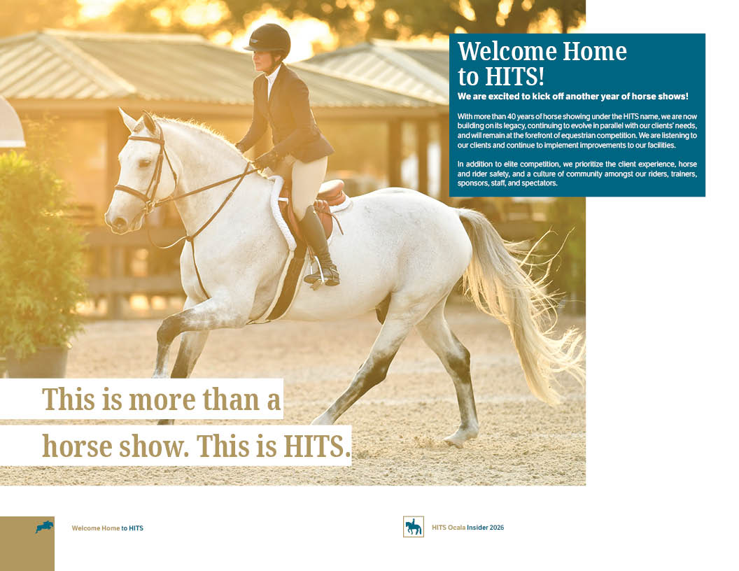 The Insider is a unique guidebook for each of the HITS venues and a trademark of the new HITS. Each venue-specific edition of The Insider provides the HITS community with carefully curated information on sponsors, local hot spots, and equestrian editorial content featuring top riders and their horses. The Insider reflects the core values of HITS: customer-focused, community-oriented, thoughtful, and luxurious. Stunning photography, compelling content, and website integrations make this a must-read for everyone at HITS.