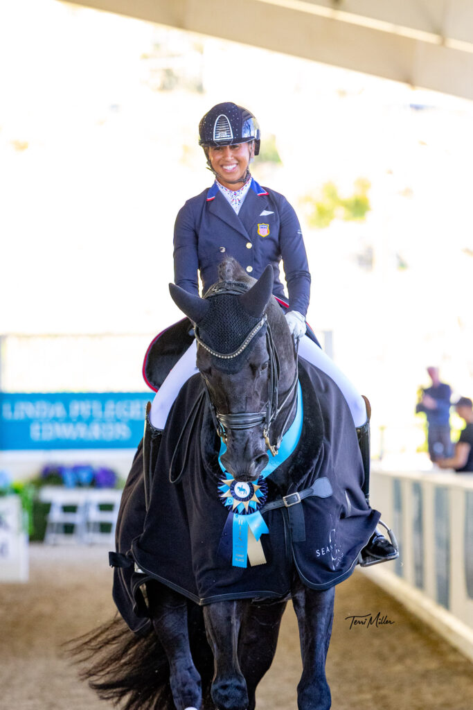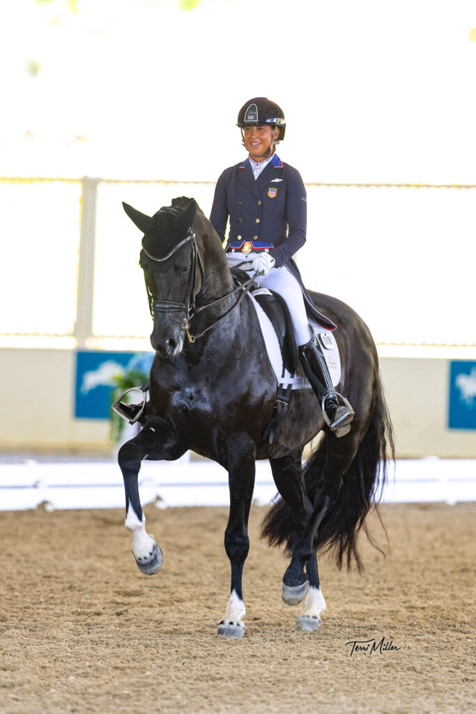 Having advanced from the qualifying round, Vaughn and Gino carried their momentum into the marquee event, the FEI World Cup™ Grand Prix Freestyle CDI-W on Saturday, February 28. Crafted by Terri Galo, the floorplan gave Gino the opportunity to unveil both his power and brilliance. Featuring songs from Vaughn’s favorite artists, such as Donna Summer, Luther Vandross, Ohio Players, and Earth, Wind & Fire, their music and interpretation of the music earned an 8.2 with other high artistic marks from Judge at C Magnus Ringmark (SWE). The pair delivered an expressive and technically precise program, ultimately posting a final score of 75.955%.